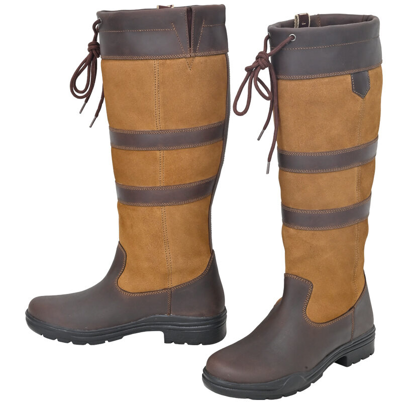 These Crazy horse leather country boots with side zip closure for easy on and off are available in two colours Brown/Tan and in different sizes. These Country Boots feature a side zip closure for easy on and off, a waterproof and synthetic fleece lining to keep your feet feeling comfortable all day long. They are made with waterproof and synthetic fleece lining. It also has a black TPR sole which provides traction and stability when you need it most.
